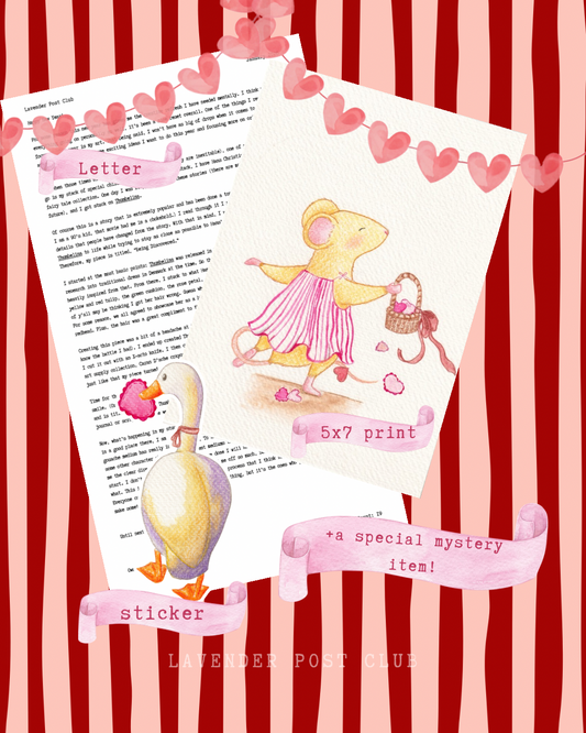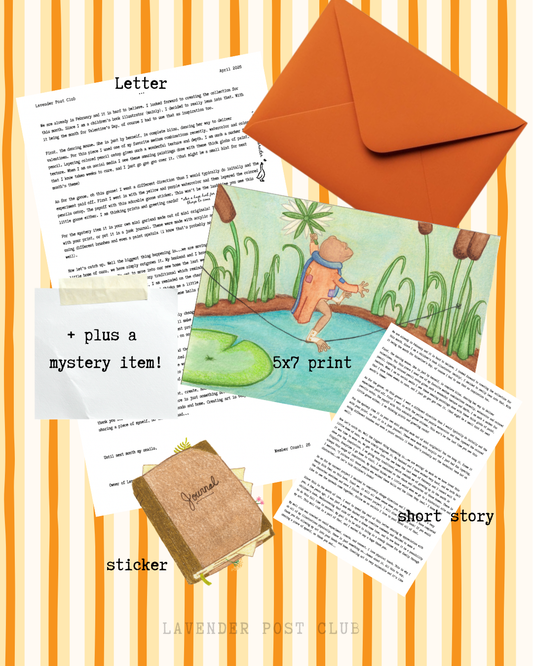 Our international mail club, Lavender Post Club, brings the same cozy nostalgic charm from our children's books to your mailbox every month. Each month you'll receive a: 5x7 print created from physical art, letter from Cat, art sticker, short story, and a special rotating mystery item.
