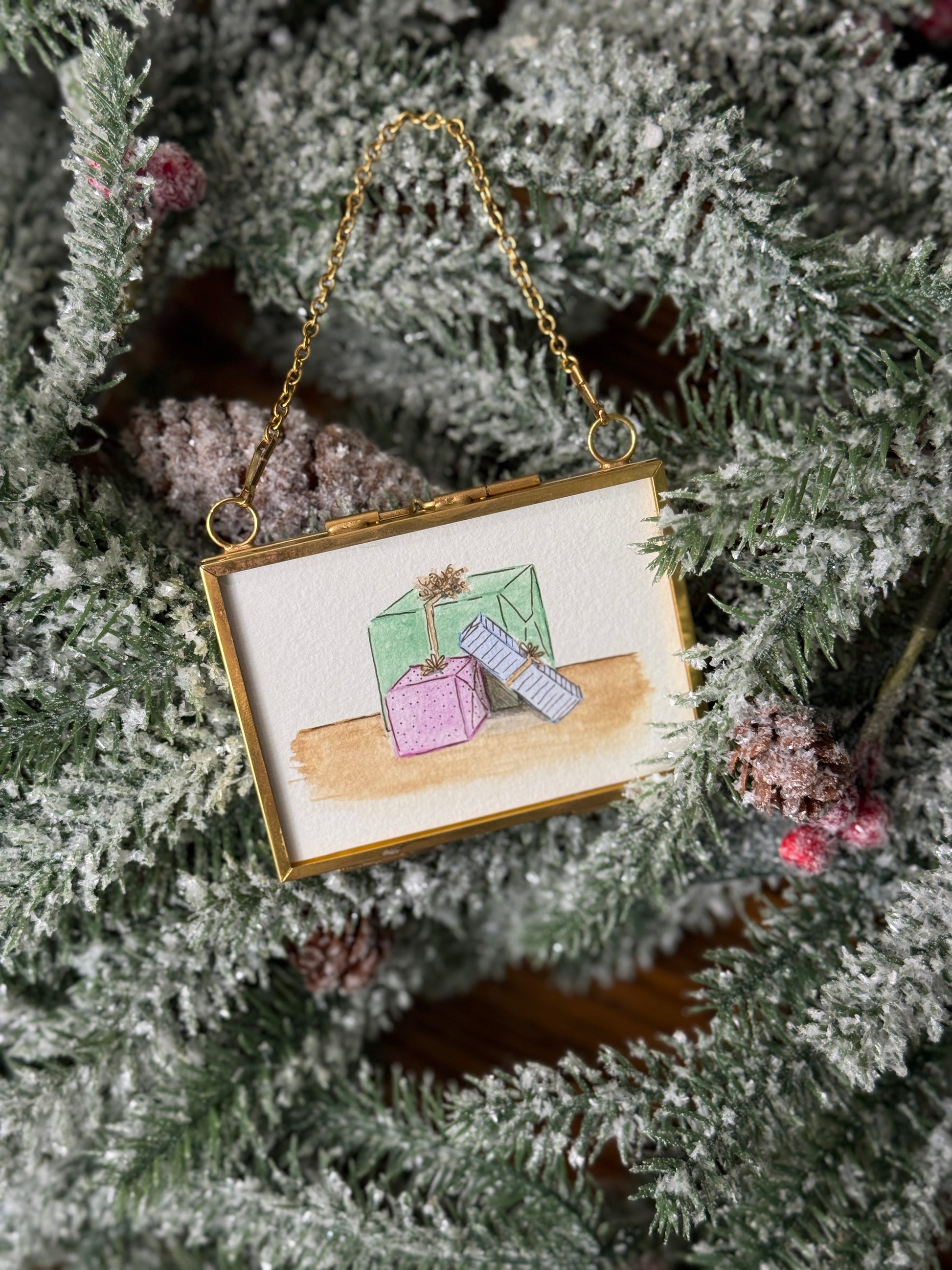 This mini original was done in watercolor and outlined in pen. This is an original piece by Catherine Parry. Use this mini frame as an ornament or place where ever you need some extra charm.