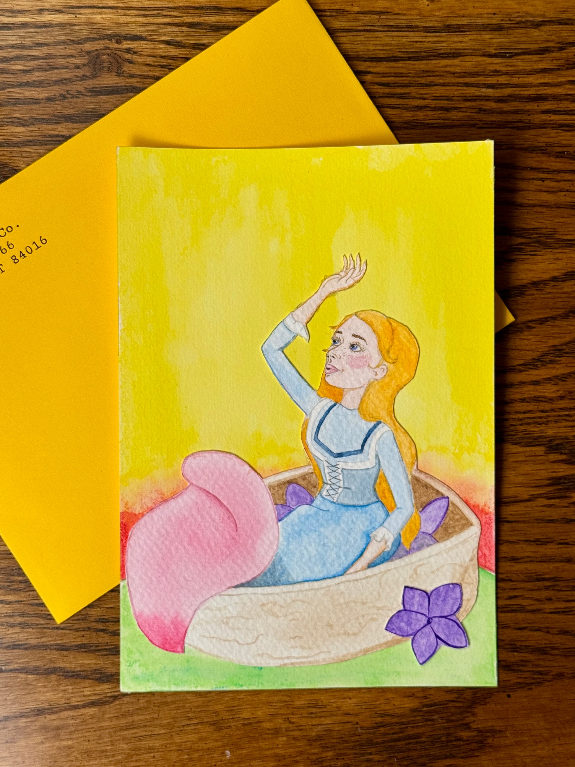 This original piece shows Thumbelina being discovered for the first time. Based off Hans Christian Andersen's original story, Thumbelina. This piece was done with watercolor and crayon with a collage assembly.