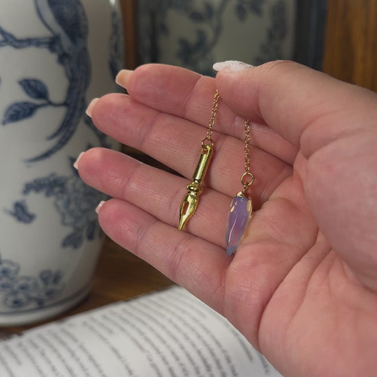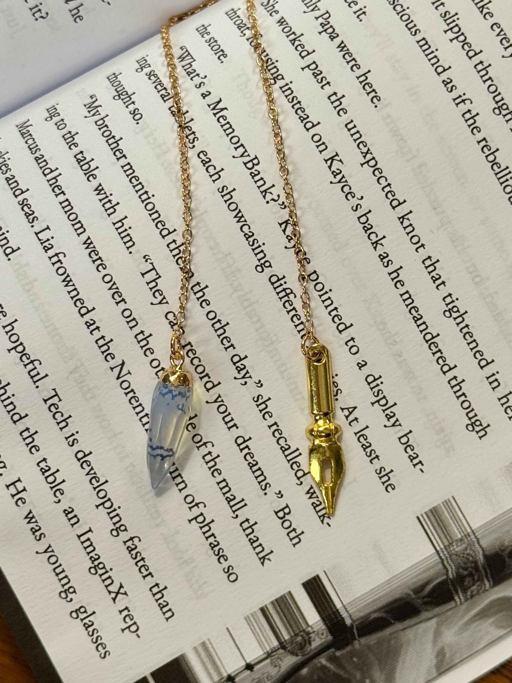 Our chain bookmarks are all created by hand. They are 10" in length and this collaboration feature a beautiful gold pen nib and accompanying stone.