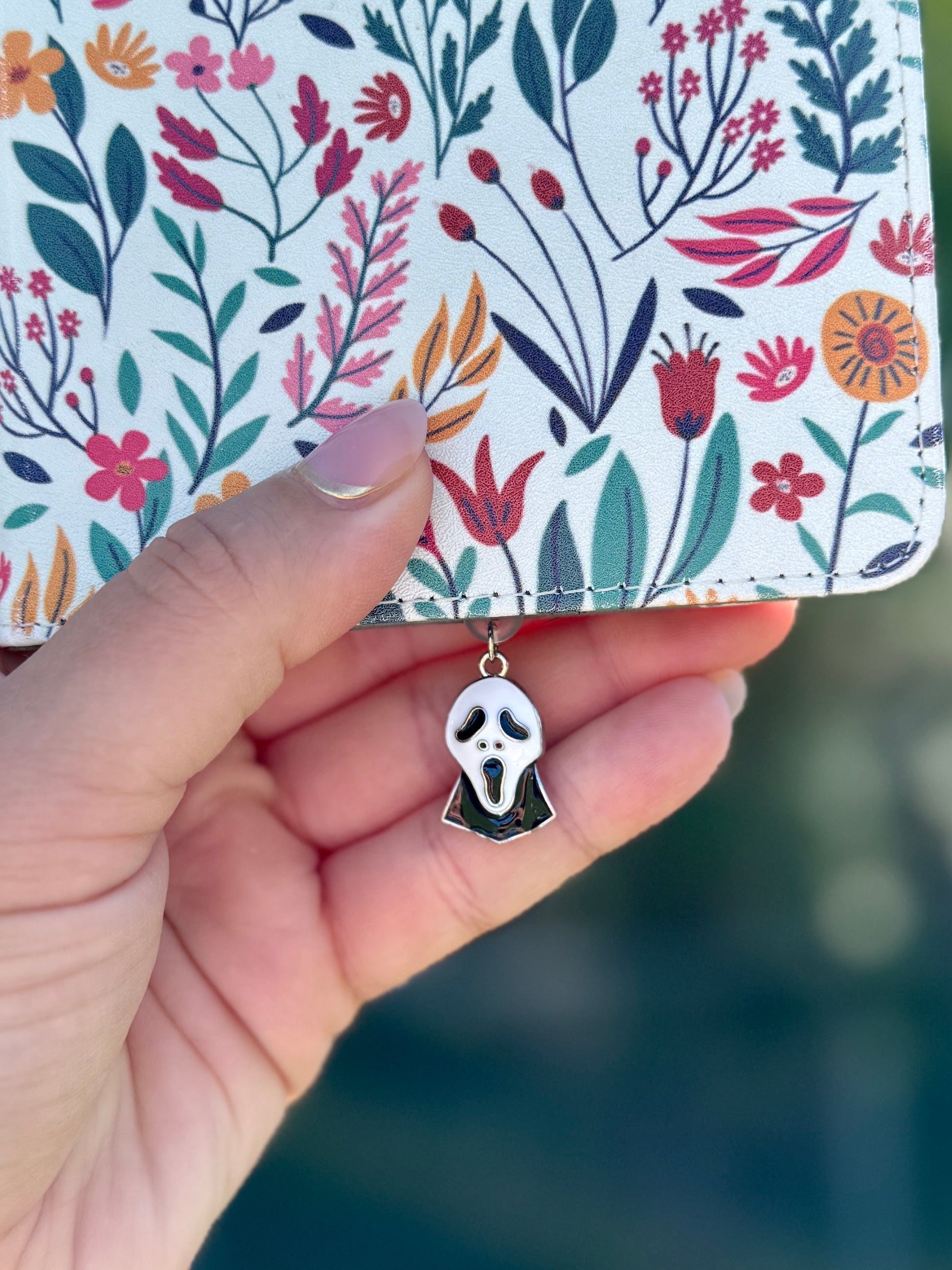 Bring the spooky season to your favorite reads with our ghost face mask charm. Designed to add personality and charm to your Kindle, e-reader, tablet case, or phone.