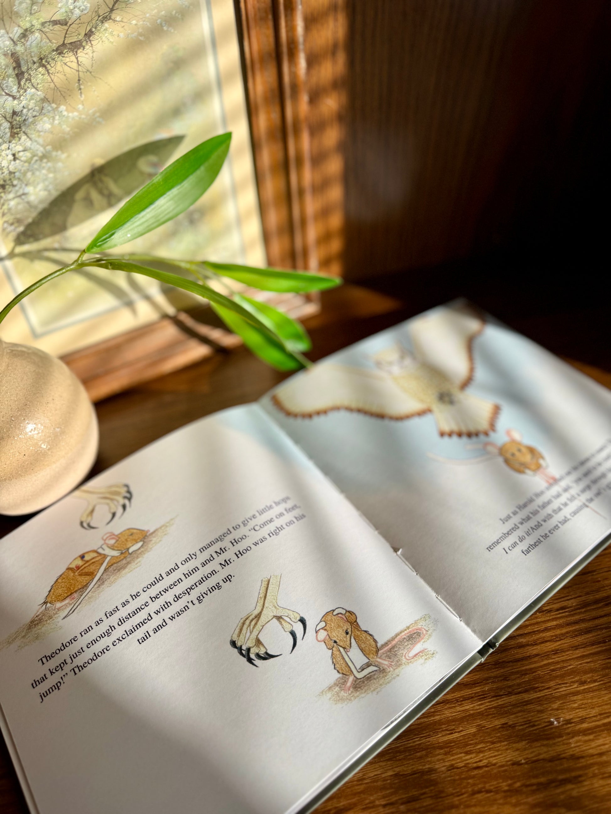 The Adventure of Theodore James follows a young woodland jumping mouse who is letting his own fear get in the way of what he wants the most, to jump as well as his dad. After being sent on an adventure by his mom he has a terrifying encounter with grumpy Harold Hoo. It's through this experience he completes the jump he has been wanting to realizing that he can accomplish scary things. He also realized where he needed to look all along for the confidence he so desperately wanted, within himself.