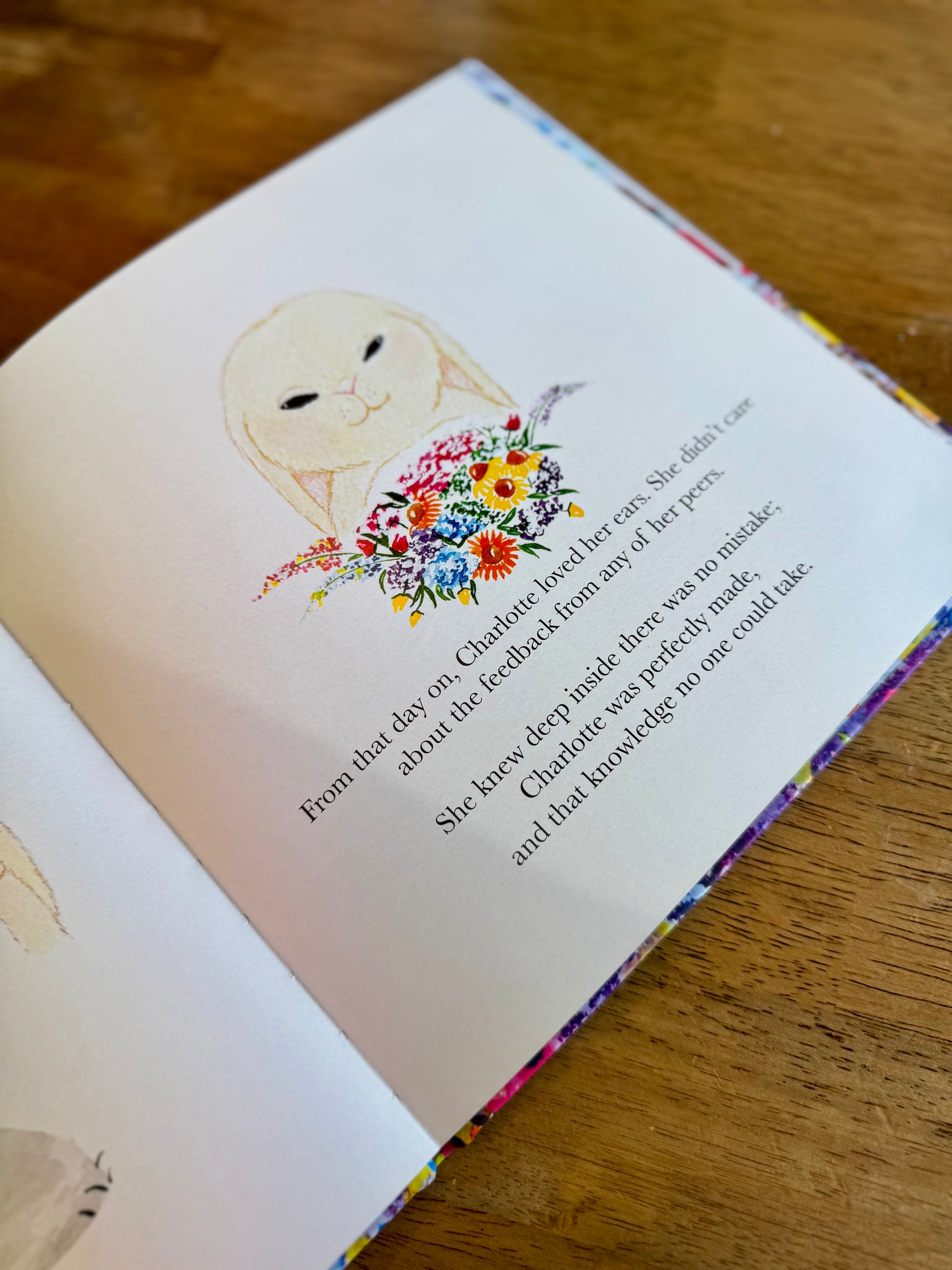 Charlotte is a carefree and spirited bunny who happens to have some larger-than-typical ears. One day a bully points out her ears, and she becomes shaken. On a walk to school she stumbles across a field of wildflowers, and this is where she learns the lesson of a lifetime; beauty is found in the variety of everyone.